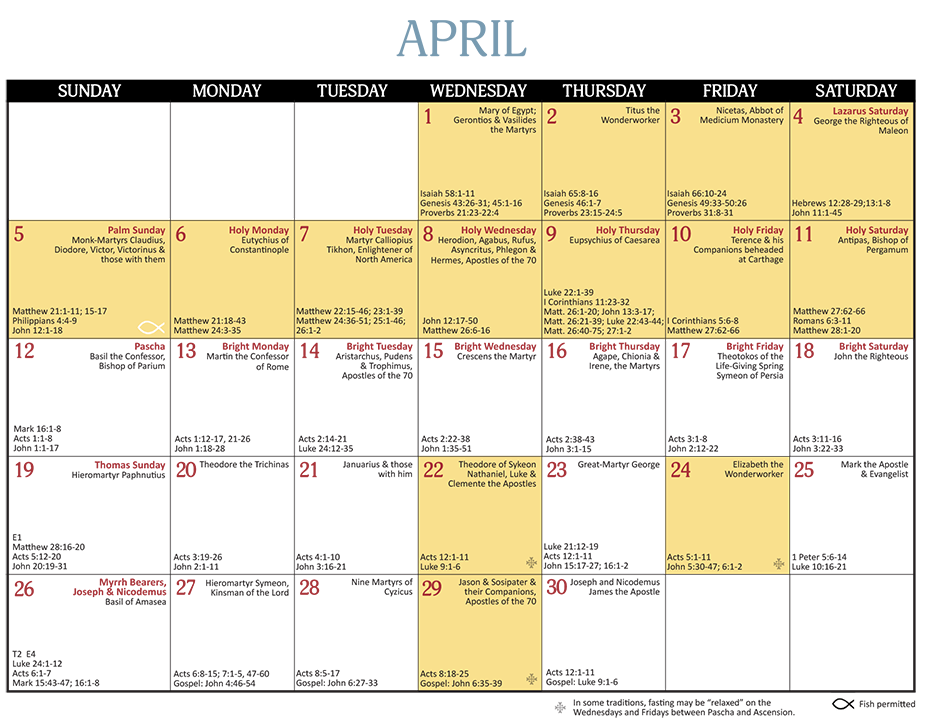 - 12-month wall calendar with lectionary according to Antiochian usage